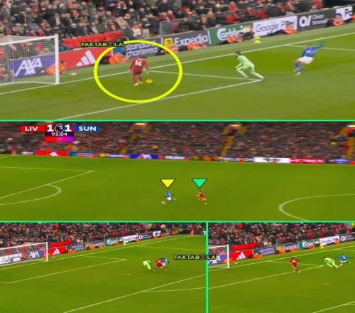 伤停补时第90+3分钟,利物浦获得角球机会,全队几乎全员压上。桑德兰门将罗埃夫斯拿到皮球之后,直接大脚开球达到前场,替补登场的伊西多尔高速前插形成单刀并成功过掉门将阿利松,然而他的射门却被狂奔半场高速回防的基耶萨成功解围。